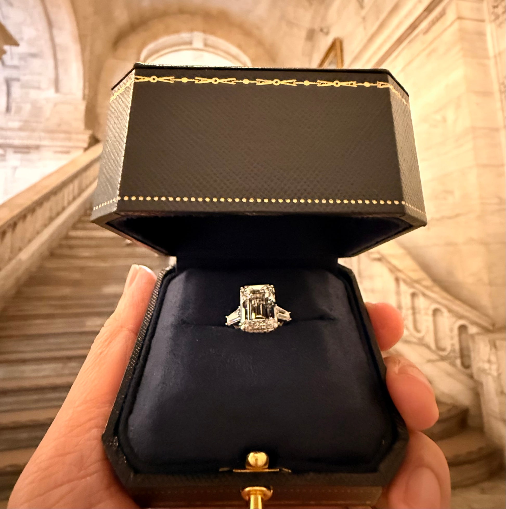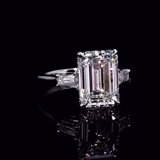 Stunning GIA certified 7.69-carat center stone G color VVS clarity emerald-shaped earth-mined diamond ring, its custom setting features 0.34 carat two tapered baguettes with diamond pave, this exquisite piece blends ethical craftsmanship with beauty. Elevate your style and conscience with this timeless symbol of elegance.